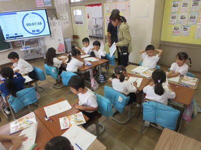 1年1組、算数の学習の様子です。繰り上がり計算の仕方をどのように説明するか考えました。