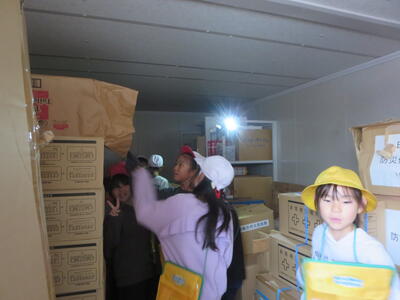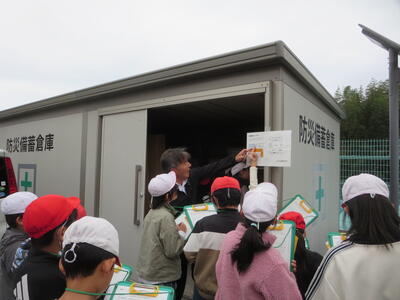 校長先生が、4年生社会科の授業を行いました。防災倉庫を開け、中を見せてくださいました。