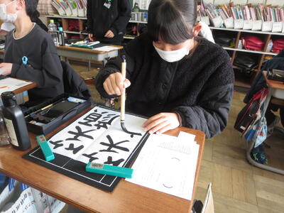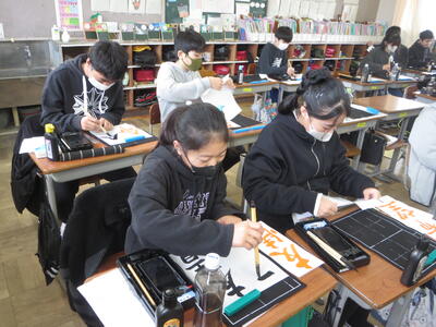 今日も6年生の話題です。卒業式会場に飾る色紙を作成しています。書家の小野先生にご指導をいただきました。